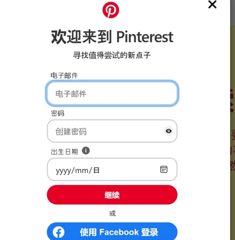 1、打开Pinterest应用/Pinterest网页版,点击注册进入账号注册界面。