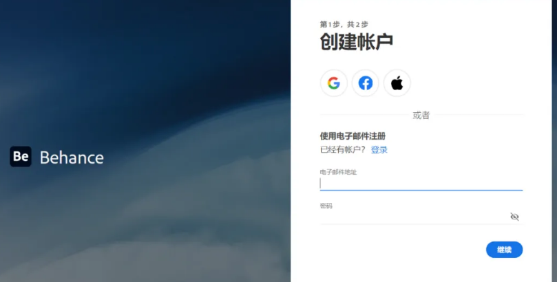 安装成功后,打开behance ,你将看到登录界面。如果你已经有账户,可以直接登录。如果你是新用户,请点击“注册”。