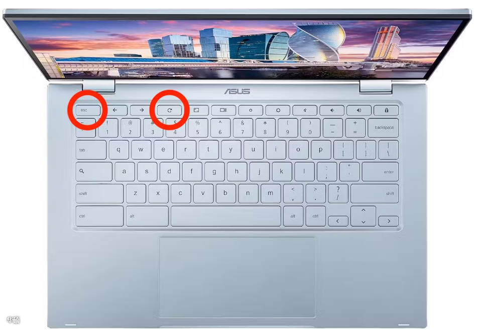 启用开发者模式的第一步是以恢复模式启动 Chromebook。如果您使用的是典型的 Chromebook 笔记本电脑,请按住键盘上的 Esc 和刷新键,然后按(但不要按住)电源按钮。