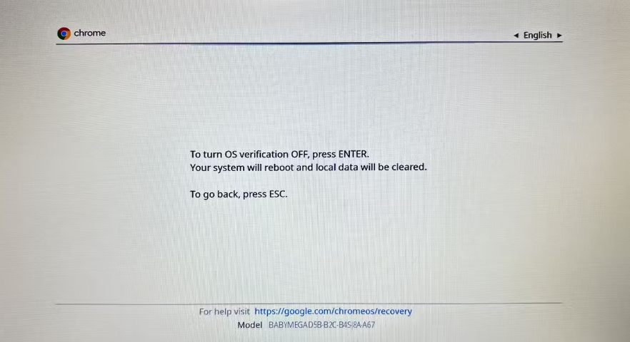 您将看到一个屏幕,显示“要关闭操作系统验证,请按 ENTER”。按 Enter 键启用开发者模式。
