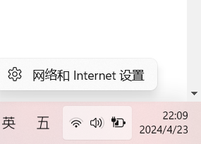 右键单击任务栏上的 Wi-Fi 图标,然后单击“打开网络和 Internet 设置”。
