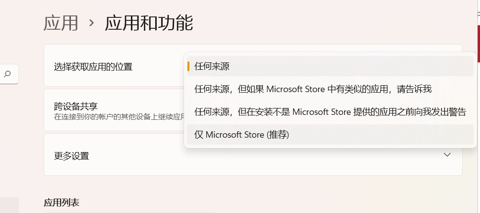 第二、打开应用和功能下的列表顶部设置“仅限 Microsoft Store(推荐)”选项。