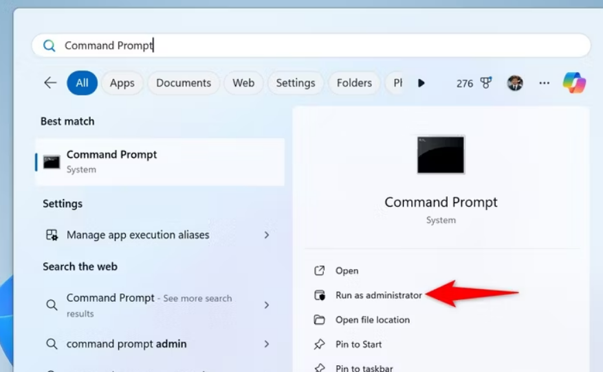要使用此方法,请访问 Windows 搜索,键入命令提示符,然后选择“以管理员身份运行”。