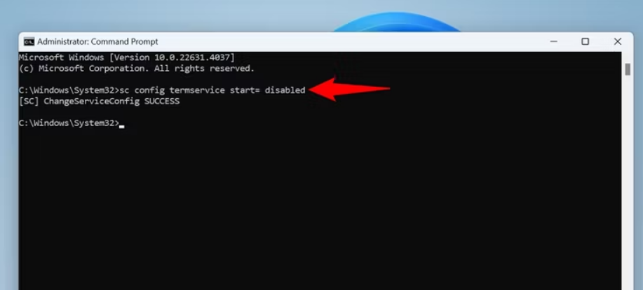接下来,输入以下命令并按 Enter。此命令可防止远程桌面服务在 PC 启动时启动。