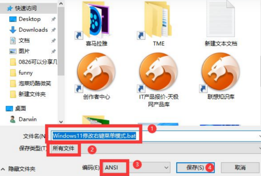 文件名处可以设置为【Windows11修改右键菜单模式.bat】,