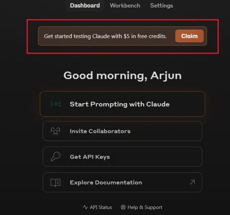 • 接下来,您将在顶部看到一条横幅,通知用户 Claude 提供 5 美元的免费积分。
