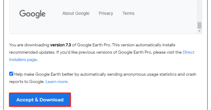 2. 检查 Google 地球的隐私政策协议,然后单击接受并下载按钮。